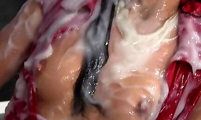 Delightful light-haired babe is sucking many black cocks, one after the other and eating some fresh cum