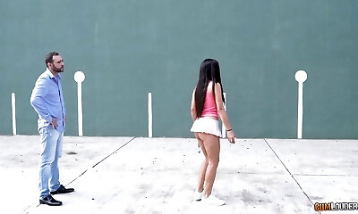 Busty girl with nice ass and tits gets horny during her exercise and begs her fitness trainer to nail her